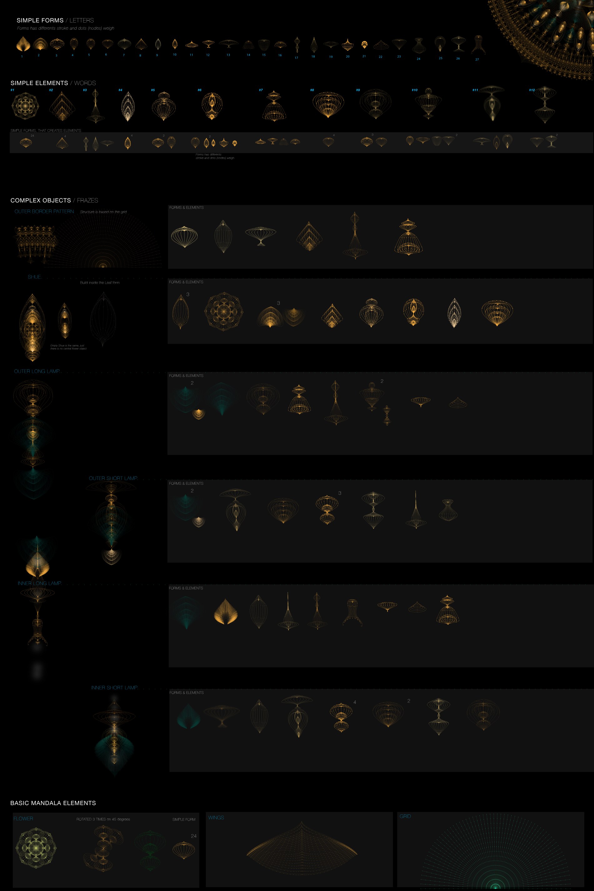 The hundreds of structures were made in Maya using a breakdown of each structure here, created to make sure no pieces were re-modeled unnecessarily. This method also helped streamline version control and made updating major sections of the mandala via Maya references much easier.