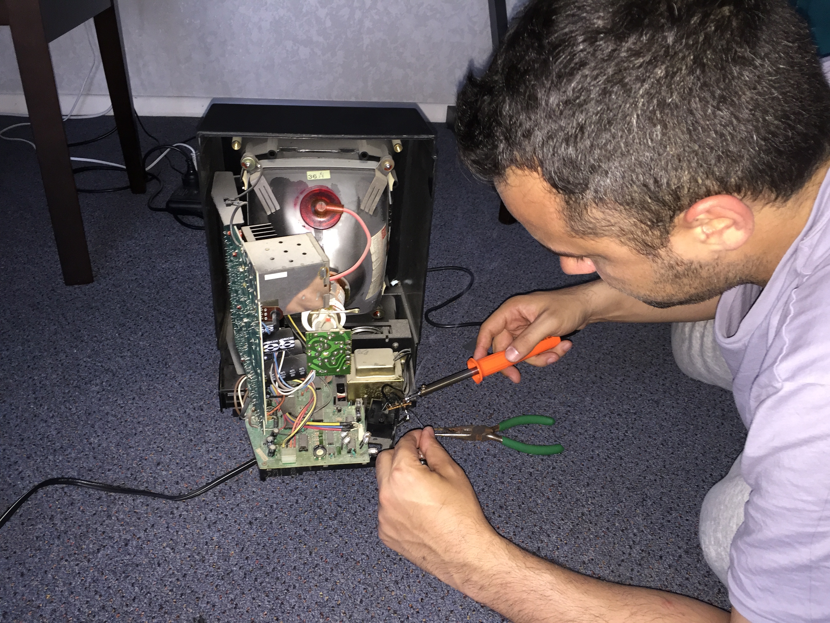 After discharging the device I went to work. I ripped the fuse out with pliers, and went to solder on the fuse… only then noticing I had forgotten wire.